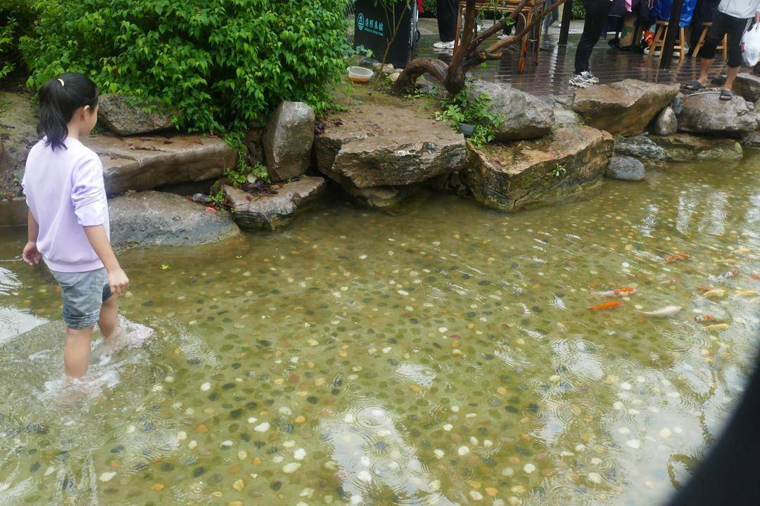 秋雨非但未能阻止大家出游的脚步,而且似乎还点燃游园的热情。古城的石桥、道路、胡同、池边……到处挤满游客。大家相互拍照,气氛火热,情绪相互感染,空气中弥漫着欢乐的节日气氛。一些游客对蒙蒙细雨毫不在意,刻意把伞收起,享受丝丝清凉。在城内一条河溪,成群的锦鲤在水中游弋,吸引岸边一波波游客驻足欣赏。一些孩童在家长的监护下,赤脚跃入水中,玩个痛快。据记者观察,凡是滨水且有挡雨的场地、酒吧、茶肆,都挤满游客,一边看雨一边赏景,其乐融融。