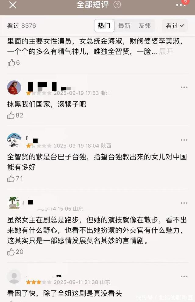该剧9月10日首播,刚开始开分7.1分,随着口碑下滑,现在评分才4.2分,估计全智贤也没有想到,她需要给国内观众道歉。 打一星的人很多,看得出来大家都被这部剧给气到不行。