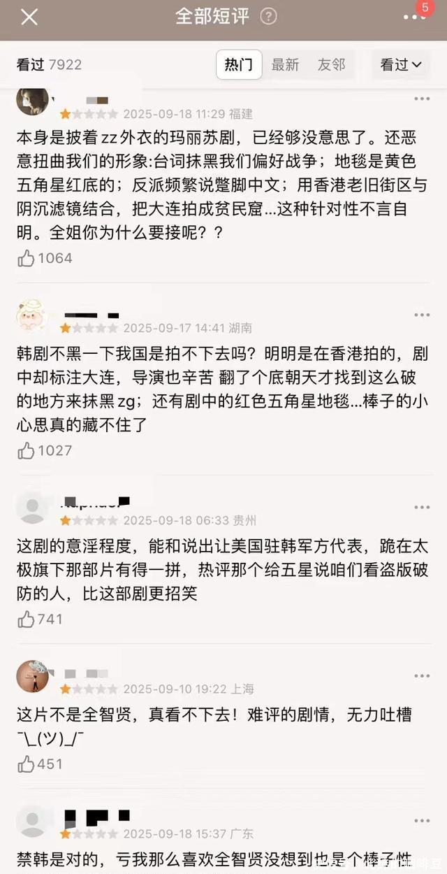 网友们都不是傻子,都看得出来这部剧的目的和动机。台词抹黑我们偏好战争;地毯是黄色五角星红底;反派频繁说蹩脚中文;用香港老旧街区与阴沉滤镜结合,把大连拍成贫民窟,针对性很强了,全智贤为什么还接? 播出五集抹黑好几处,所以安的什么心? 评分低,差评多,都是《暴风圈》应得的,它真的很疯魔,胡说八道,蓄意揣测别人,恶意中伤,毫无事实依据抹黑我们,真的罪不可赦。 3.品牌下架全智贤广告