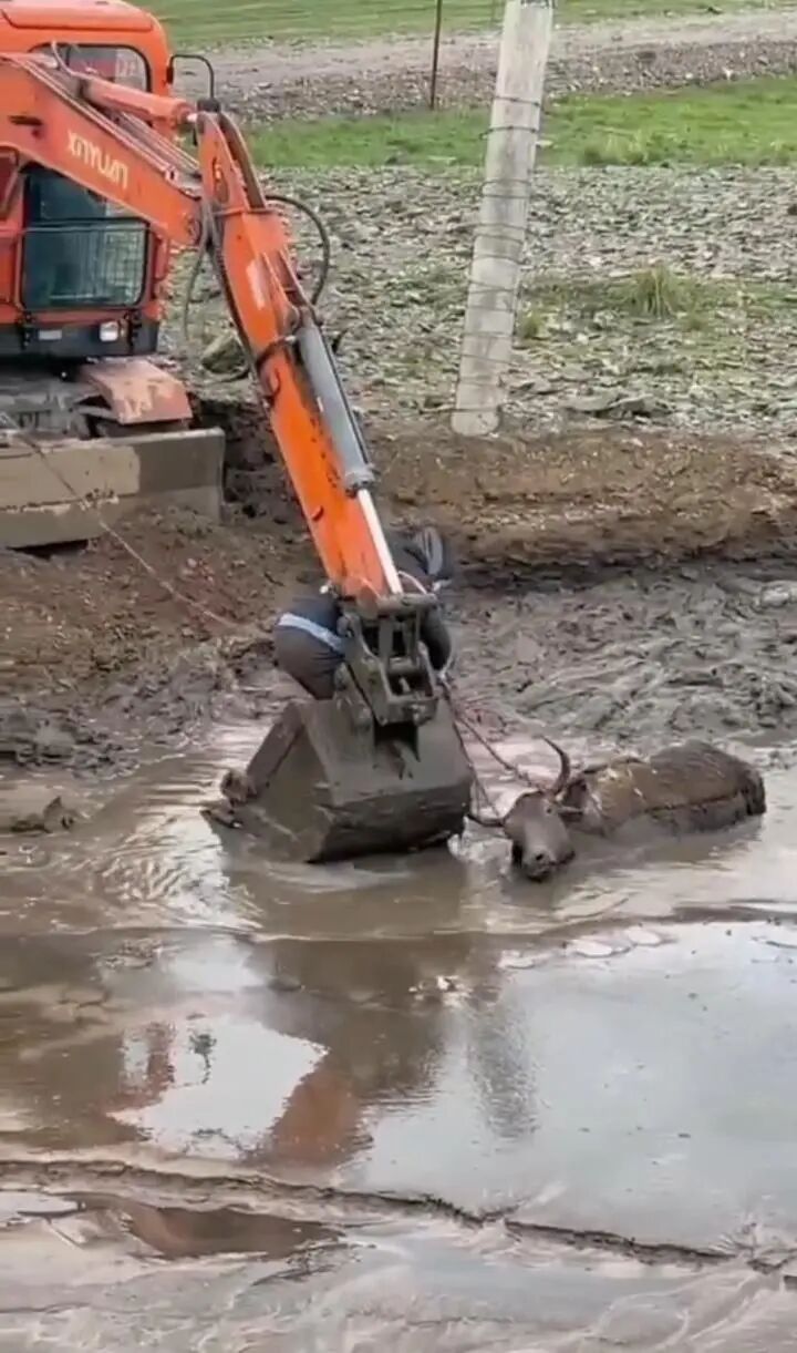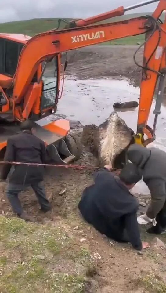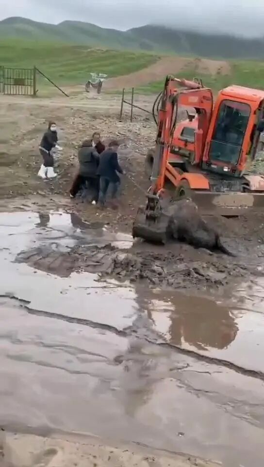 杨先生下车查看时,另一辆自驾车辆也停住,走下来两个人。他们沿途找了几百米,找到这4头牦牛的主人。他们一起来到泥坑处,但凭人力无法将牛救起。“牧民说话我们听不懂,大致意思是附近有一个修路的工地。”杨先生介绍,他们一起到工地上喊了一台挖掘机,尝试帮忙把牛救起。